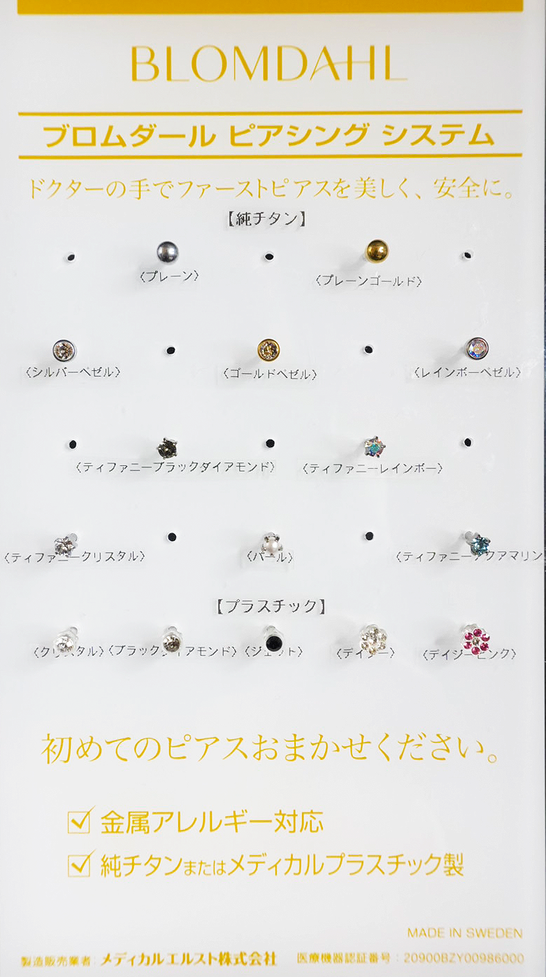 当院では、安全性を最優先に考えたスウェーデン発・医療用ピアスメーカー「ブロムダール(Blomdahl)社」のピアスを採用しています。皮膚科医と共同開発を行い、「金属アレルギーの不安を最小限に、誰もが安心して身につけられるピアス」をコンセプトに製造されています。